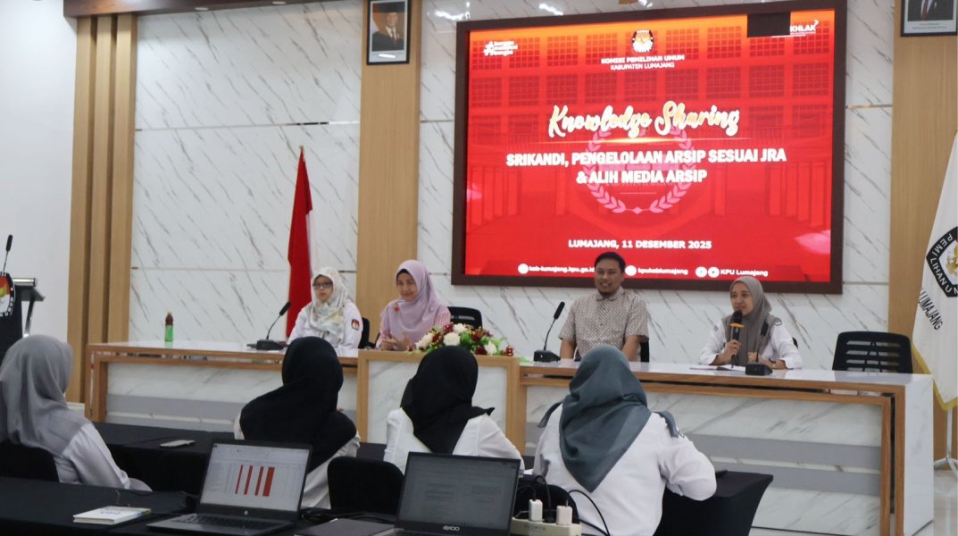 Lumajang - kab-lumajang.kpu.go.id - Komisi Pemilihan Umum (KPU) Kabupaten Lumajang menggelar kegiatan Knowledge Sharing Penggunaan Aplikasi Srikandi, Pengelolaan Arsip Sesuai Jadwal Retensi Arsip (JRA), serta Alih Media Arsip, pada Kamis, 11 Desember 2025, bertempat di Aula KPU Lumajang. Kegiatan ini diikuti oleh seluruh jajaran sekretariat. Acara dibuka oleh Divisi Sosialisasi, Pendidikan Pemilih, Partisipasi Masyarakat, dan SDM, Halim Bahriz. Dalam sambutannya, ia menekankan pentingnya peningkatan kapasitas SDM dalam pengelolaan arsip, mengingat arsip merupakan elemen vital yang mendukung akuntabilitas dan transparansi lembaga. Pada sesi pemaparan, narasumber dari sub bagian Keuangan, Umum, dan Logistik menjelaskan secara rinci mengenai penggunaan aplikasi Srikandi sebagai platform digital pengelolaan surat-menyurat dan arsip. Kegiatan kemudian dilanjutkan dengan pemahaman mengenai penerapan Jadwal Retensi Arsip (JRA) di lingkungan KPU Kabupaten Lumajang, serta prosedur alih media arsip sebagai langkah adaptasi terhadap kebutuhan digitalisasi dokumen kelembagaan. Melalui kegiatan ini, KPU Kabupaten Lumajang berharap seluruh jajaran sekretariat dapat meningkatkan pemahaman dan keterampilan teknis dalam pengelolaan arsip secara tertib, sistematis, dan sesuai ketentuan peraturan perundang-undangan. Pemanfaatan aplikasi Srikandi, penerapan Jadwal Retensi Arsip (JRA), serta alih media arsip diharapkan mampu mewujudkan tata kelola arsip yang efektif, efisien, dan berkelanjutan. Selain itu, kegiatan knowledge sharing ini juga menjadi sarana penyamaan persepsi antarbagian dalam pelaksanaan pengelolaan arsip, sehingga tercipta keseragaman prosedur dan peningkatan kualitas layanan administrasi di lingkungan KPU Kabupaten Lumajang. Dengan pengelolaan arsip yang baik, akuntabilitas kinerja kelembagaan dapat terus terjaga sekaligus mendukung transparansi penyelenggaraan pemilu. KPU Kabupaten Lumajang berkomitmen untuk terus mendorong peningkatan kapasitas sumber daya manusia melalui kegiatan pembelajaran internal, sebagai bagian dari upaya penguatan kelembagaan dan adaptasi terhadap perkembangan teknologi informasi di bidang administrasi dan kearsipan. ....