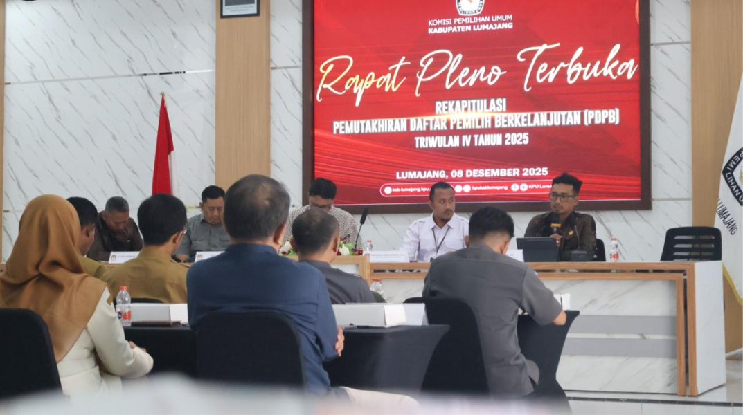 Lumajang, kab-lumajang.kpu.go.id - Komisi Pemilihan Umum (KPU) Kabupaten Lumajang menggelar Rapat Pleno Terbuka Rekapitulasi Daftar Pemilih Berkelanjutan (PDPB) Triwulan IV Tahun 2025 pada Senin, 8 Desember 2025, bertempat di Aula KPU Lumajang. Kegiatan ini dihadiri oleh Ketua, seluruh anggota KPU Lumajang, serta sekretariat KPU. Rapat pleno dibuka secara resmi oleh Ketua KPU Lumajang, Henariza Febriadmadja, yang dalam sambutannya menegaskan pentingnya akurasi data pemilih sebagai fondasi penyelenggaraan pemilu yang berkualitas. Ia juga mengapresiasi seluruh pihak yang selama ini berkolaborasi dalam proses pemutakhiran data pemilih berkelanjutan. Kegiatan tersebut turut dihadiri oleh berbagai instansi pemerintahan dan lembaga terkait, di antaranya Polres Lumajang, Kodim 0821, Bakesbangpol, Kementerian Agama, Cabang Dinas Pendidikan Jawa Timur Wilayah Kabupaten Lumajang, Disdukcapil, Dinas Sosial, Lapas Lumajang, BPJS Kesehatan, BPJS Ketenagakerjaan, BPS Lumajang, serta Bawaslu Lumajang sebagai mitra strategis dalam pengawasan proses pemutakhiran data. Selain agenda rekapitulasi, KPU Lumajang juga membagikan buku cerita Pilkada Lumajang 2024 berjudul “Renjana Kotak Suara” kepada seluruh peserta rapat. Buku tersebut merupakan media edukasi kepemiluan yang dikemas secara ringan dan menarik, dengan harapan dapat menambah wawasan serta memperkuat literasi demokrasi di kalangan masyarakat dan pemangku kepentingan. ....