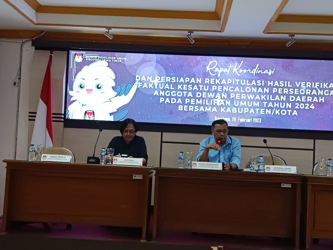 Surabaya, kab-lumajang.kpu.go.id – Komisi Pemilihan Umum (KPU) Kabupaten Lumajang hadiri Rekapitulasi Hasil Verifikasi Faktual Kesatu Pencalonan Perseorangan Anggota DPD pada Pemilu Tahun 2024 Tingkat Provinsi Jawa Timur bersama KPU Kabupaten/Kota Se-Jawa Timur, Rabu (01/3/23). Bertempat di Hotel Platinum, Jl. Tunjungan No. 11 - 21 Surabaya, rekapitulasi dimulai pada pukul 10.00 - 15.00 WIB. Acara dibuka secara resmi oleh Ketua KPU Jatim Choirul Anam beserta Anggota Insan Qoriawan, M. Arbayanto, Rochani, dan Nurul Amalia. Setelah pembukaan, acara dilanjutkan dengan proses rekapitulasi dilakukan dengan membacakan Berita Acara hasil verifikasi faktual dukungan setiap Bacalon dari setiap Kabupaten/Kota oleh masing-masing KPU Kabupaten/Kota secara bergantian. Lima orang komisioner KPU Jatim yang hadir secara bergantian memimpin proses pembacaan sampai selesai. Sehingga, diketahui berapa jumlah sampel dukungan yang diverifikasi, jumlah dukungan yang Memenuhi Syarat (MS), Tidak Memenuhi Syarat (TMS), Jumlah proyeksi MS dan proyeksi sebaran dukungan yang MS. Dari hasil rekapitulasi tersebut diketahui sebanyak 6 dari 20 Bakal Calon Anggota (Bacalon) Anggota Dewan Perwakilan Daerah (DPD) dinyatakan Memenuhi Syarat pada tahapan verifikasi faktual dukungan pemilih kesatu. Anggota KPU Jatim Divisi Teknis Penyelenggaraan Insan Qoriawan mengatakan proses verifikasi faktual merupakan rangkaian tahapan yang harus dilalui sebelum Bacalon mendaftar sebagai Calon. "Ini proses yang harus ditempuh oleh Bacalon agar dapat mencalonkan diri pada pencalonan perseorangan Anggota DPD pada Pemilu 2024," terang Insan. "Artinya 6 Bacalon yang status dukungan dan sebaran dinyatakan MS (Memenuhi Syarat) pada tahapan verifikasi faktual kesatu ini tidak perlu melalukan perbaikan, tinggal menunggu penetapan pemenuhan syarat dukungan minimal pemilih dan sebaran pada bulan april," lanjut Insan. Sedangkan terhadap 14 Bacalon yang berstatus Tidak Memenuhi Syarat, KPU masih memberikan kesempatan untuk melalukan perbaikan pada masa perbaikan. "Bacalon yang berstatus TMS dapat melakukan perbaikan dukungan sesuai dengan waktu yang telah dijadwalkan," ujar mantan anggota KPU Pasuruan tersebut. Adapun masa penyerahan dukungan minimal pemilih perbaikan kedua sesuai dengan Peraturan KPU Nomor 10 Tahun 2022 tentang Pencalonan Perseorangan Anggota DPD, dilaksanakan selama 10 hari mulai tanggal 2 sampai dengan 11 Maret 2023 melalui Sistem Informasi Pencalonan (Silon). Untuk selanjutnya, dukungan perbaikan kedua akan dilakukan verifikasi administrasi pada 12 sampai 21 Maret 2023. Diteruskan dengan verifikasi faktual kedua pada 26 Maret sampai 8 April 2023. Untuk diketahui, enam Bacalon yang dinyatakan Memenuhi Syarat di antaranya AA La Nyalla Mahmud Mattalitti, AA Nawardi, Abdul Qadir Amir Hartanto, Agus Rahardjo, Evi Zainal Abidin, dan Kondang Kusumaning Ayu. Sedangkan empat belas lainnya yang Belum Memenuhi Syarat yaitu Aisyah Aleena, Adilla Azis, Ayub Khan, Bambang Harianto, Catur Rudi Utanto, Doddy Dwi Nugroho, Emilia Contessa, Erlyta Dwi A Siregar, Khoirul Arif Rohman, Kunjung Wahyudi, Lia Istifhama, Mohammad Trijanto, Narto SK Dentopuro, dan Siti Rafika Hardhiansari. Rekapitulasi Hasil Verifikasi Faktual Kesatu Pencalonan Perseorangan Anggota DPD pada Pemilu Tahun 2024 dilaksanakan dengan mengundang LO dari masing-masing Bakal Calon Anggota DPD, Bawaslu Provinsi Jawa Timur, Anggota KPU Divisi Teknis Penyelenggaraan, Kasubbag Tekmas, dan Operator Silon KPU Kabupaten/Kota Se-Jawa Timur.