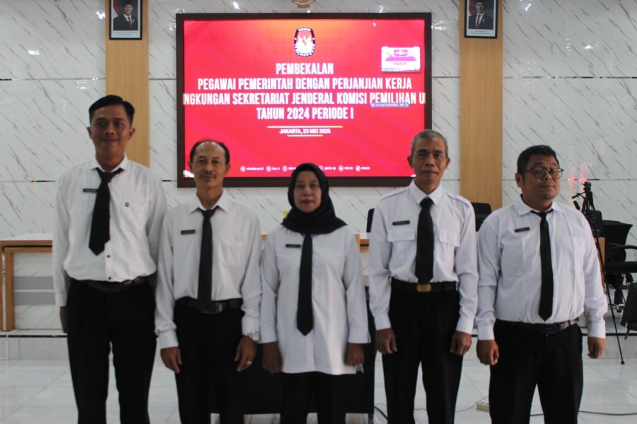 Lumajang, kab-lumajang.kpu.go.id – Lima orang PPPK Periode I Komisi Pemilihan Umum Kabupaten Lumajang mengikuti pelaksanaan Pembekalan dan Pengambilan Sumpah/Janji Pegawai Pemerintah dengan Perjanjian Kerja (PPPK) di Lingkungan Sekretariat Jenderal Komisi Pemilihan Umum Tahun 2024 Periode I pada Jum’at, 25 Mei 2025 pukul 08.00. Kegiatan dilaksanakan melalui zoom meeting di Aula KPU Kabupaten Lumajang Jl. Veteran Nomor 70 Lumajang. Sebelum pelantikan terlebih dahulu dilakukan pembekalan oleh KPU RI dengan menghadirkan narasumber dari KPU dan BKN. Adapun materi pembekalan meliputi pengarahan umum, pemaparan tentang hak dan kewajiban PPPK, serta pemaparan tentang disiplin PPPK. Acara kemudian dilanjutkan dengan pengambilan sumpah/ janji dipimpin langsung oleh Sekretaris Jenderal KPU RI, Bernad Dermawan Sutrisno. Beliau berpesan agar PPPK bersikap profesional dan disiplin dalam melaksanakan pekerjaan. Selamat atas keberhasilan menjadi PPPK dan selamat menjalankan tugas