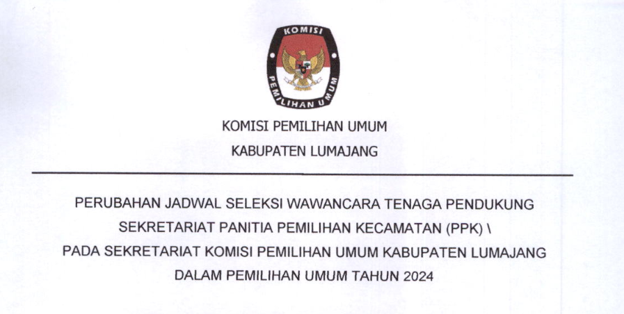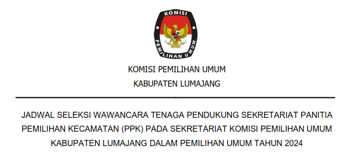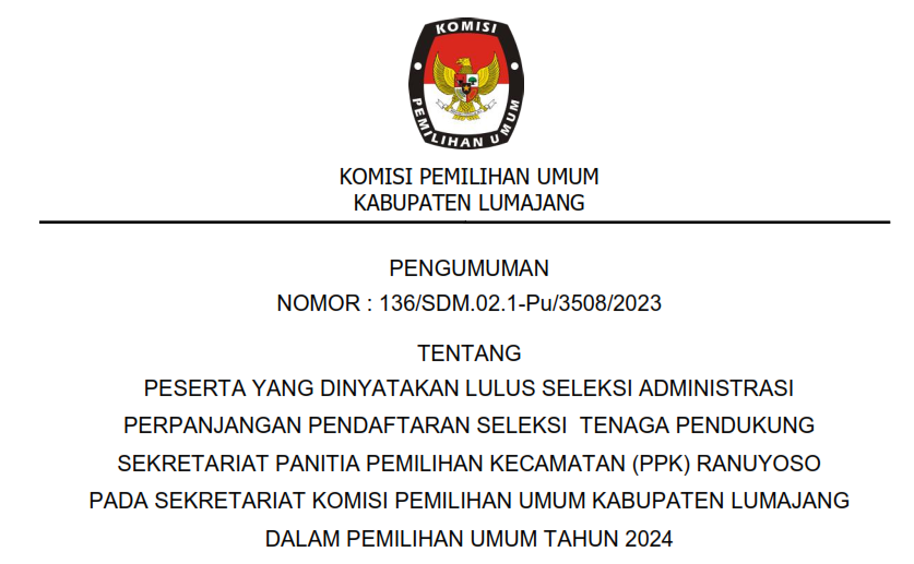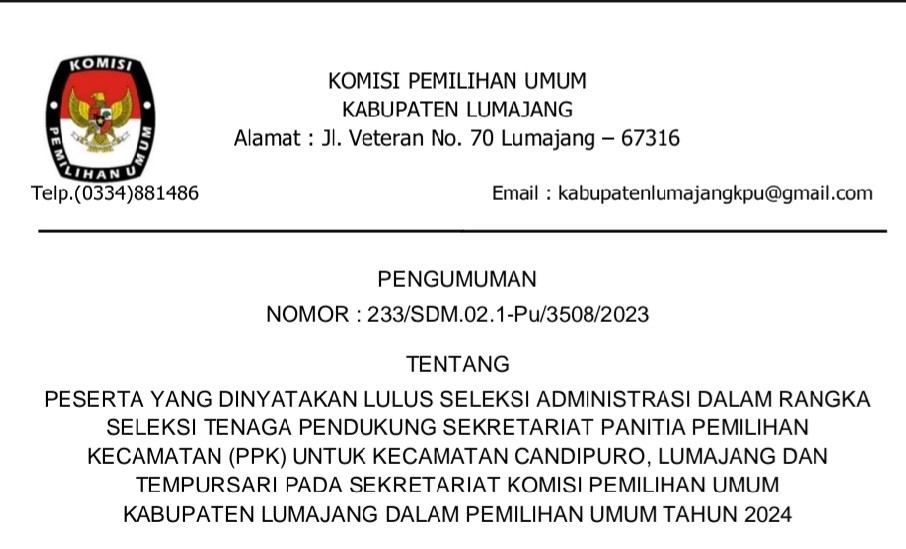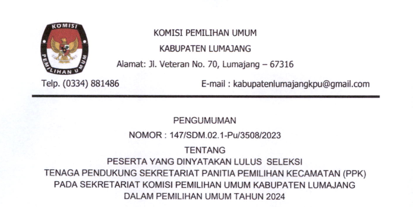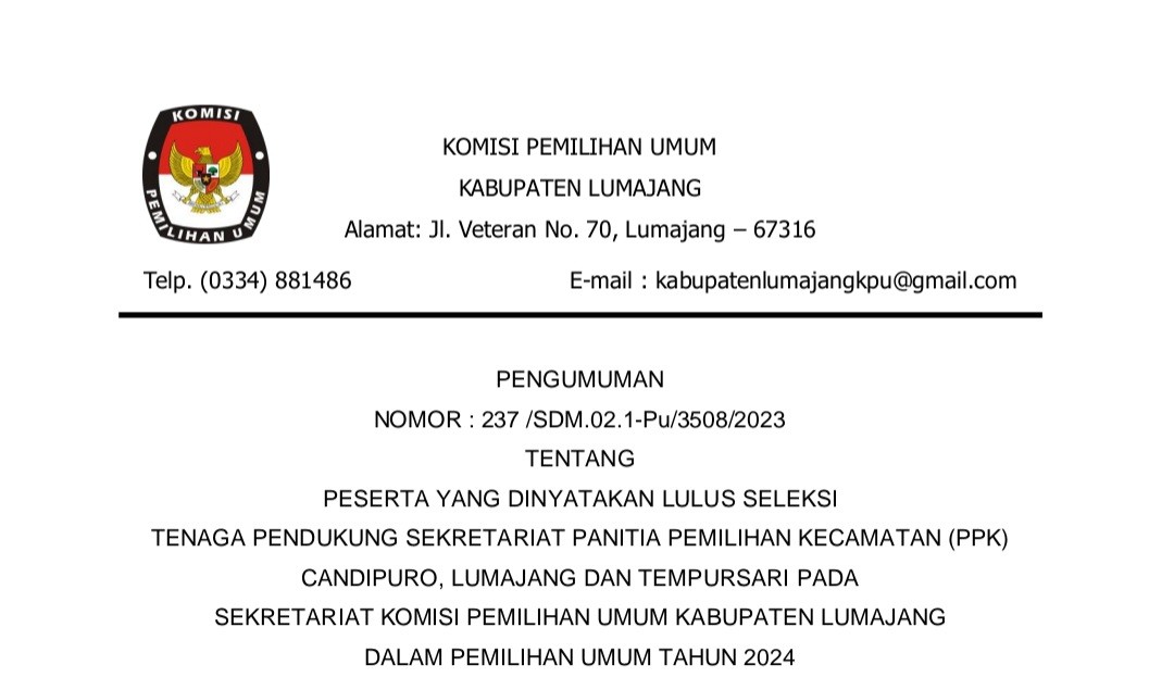 Berikut Pengumuman Peserta yang Dinyatakan Lulus Seleksi Tenaga Pendukung Sekretariat Panitia Pemilihan Kecamatan (PPK) Candipuro, Lumajang dan Tempursari Pada Sekretariat Komisi Pemilihan Umum Kabupaten Lumajang Dalam Pemilihan Umum Tahun 2024, Informasi Lebih Lanjut Klik disini