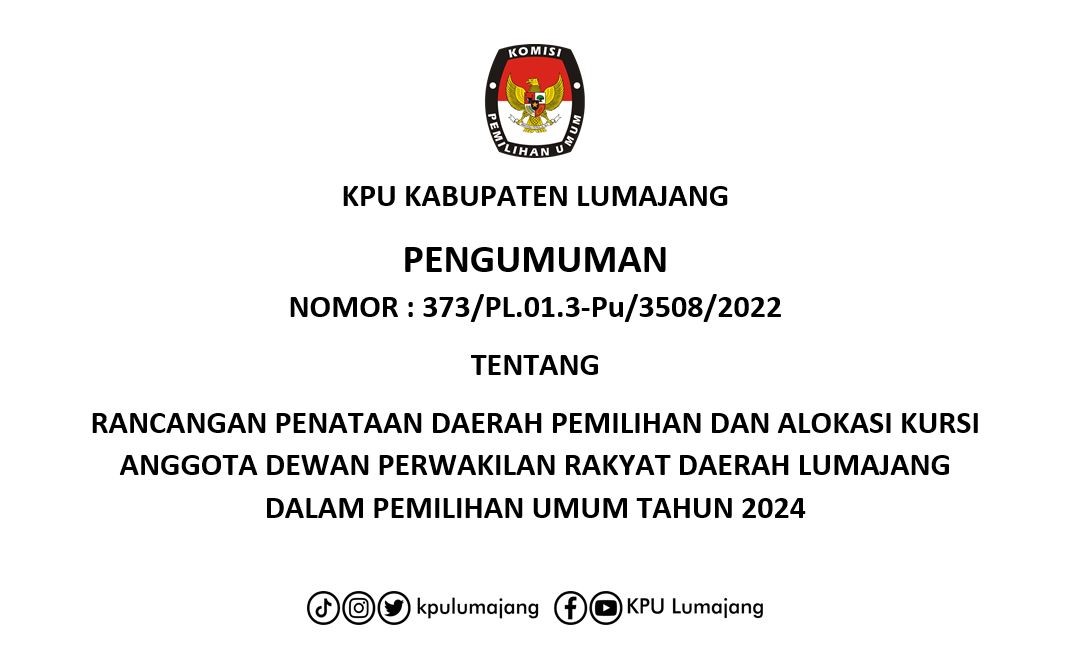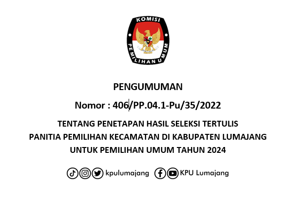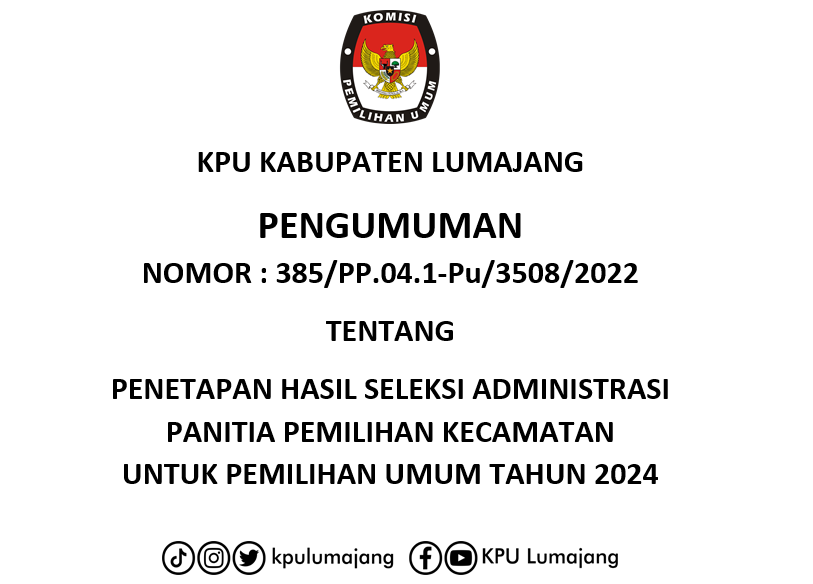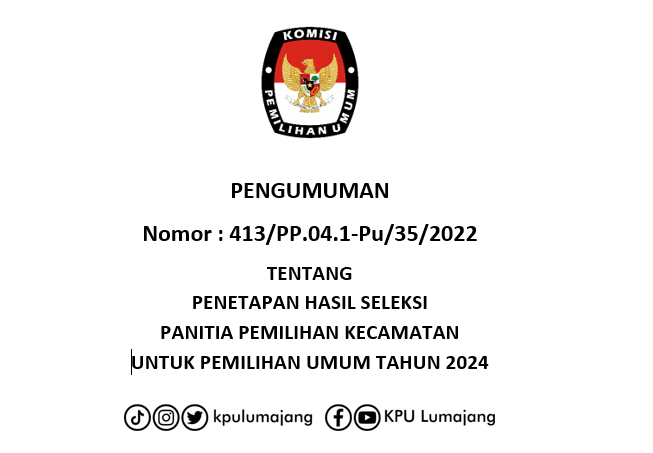Dalam rangka pembentukan Panitia Pemilihan Kecamatan untuk Pemilihan Umum, Komisi Pemilihan Umum Kabupaten Lumajang mengundang Warga Negara Indonesia yang memenuhi persyaratan untuk mendaftarkan diri menjadi anggota Panitia Pemilihan Kecamatan untuk Pemilihan Umum dengan ketentuan sebagai berikut