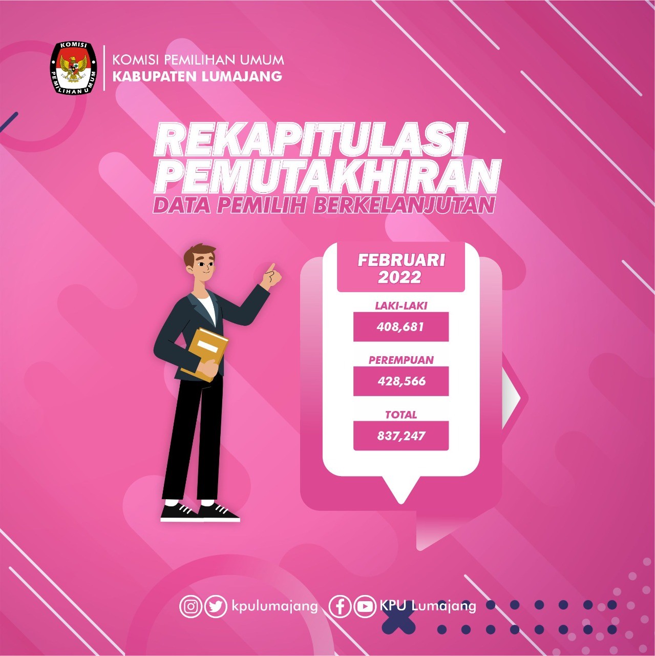 Pengumuman Rekapitulasi Daftar Pemilih Berkelanjutan Bulan Februari Tahun 2022 Senin, 04 April 2022 00:00 596 Berikut ini disampaikan hasil Rekapitulasi Pemutakhiran Daftar Pemilih Berkelanjutan Bulan Februari Tahun 2022 : Baca Selengkapnya