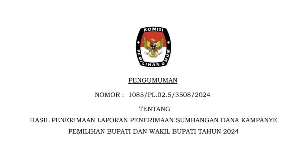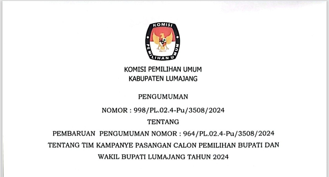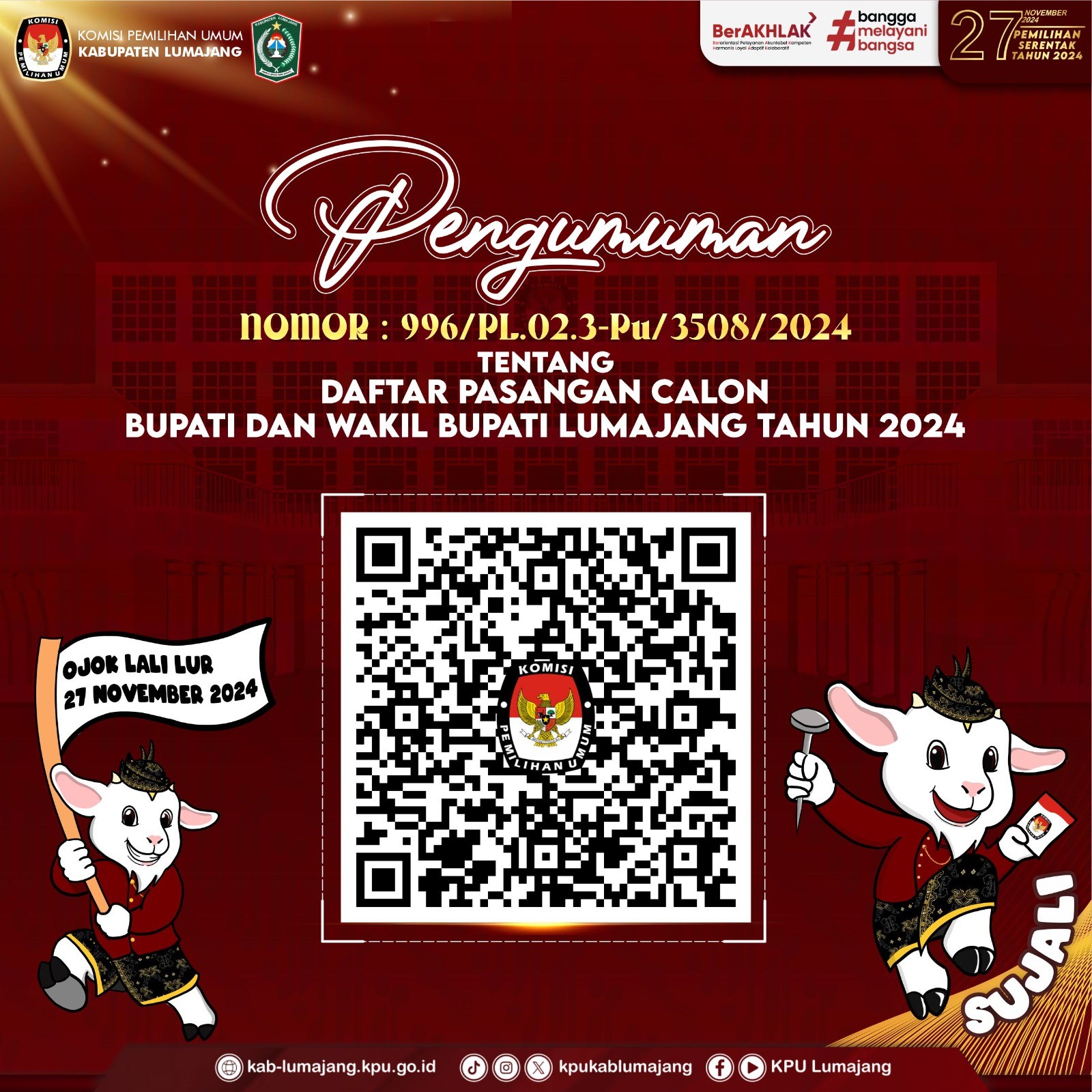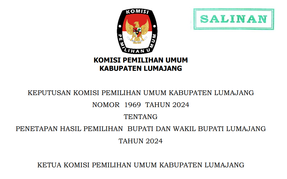 Berikut Keputusan Komisi Pemilihan Umum Kabupaten Lumajang Nomor 1969 Tahun 2024 Tentang Penetapan Hasil Pemilihan Bupati dan Wakil Bupati Lumajang Tahun 2024. Selengkapnya klik tautan dibawah ini