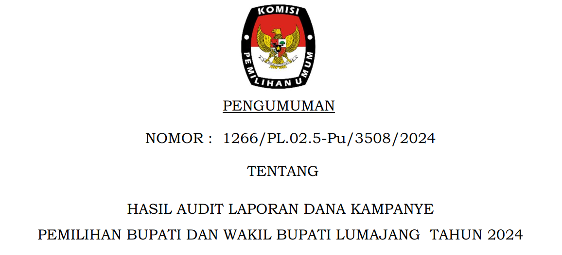 Berikut Pengumuman Hasil Audit Laporan Dana Kampanye Pemilihan Bupati dan Wakil Bupati Lumajang Tahun 2024. Pengumuman selengkapnya klik tautan dibawah ini