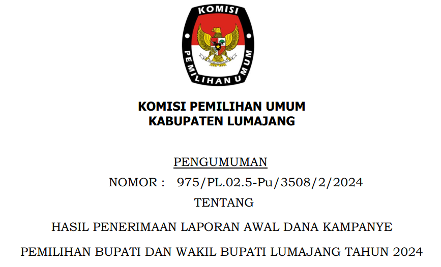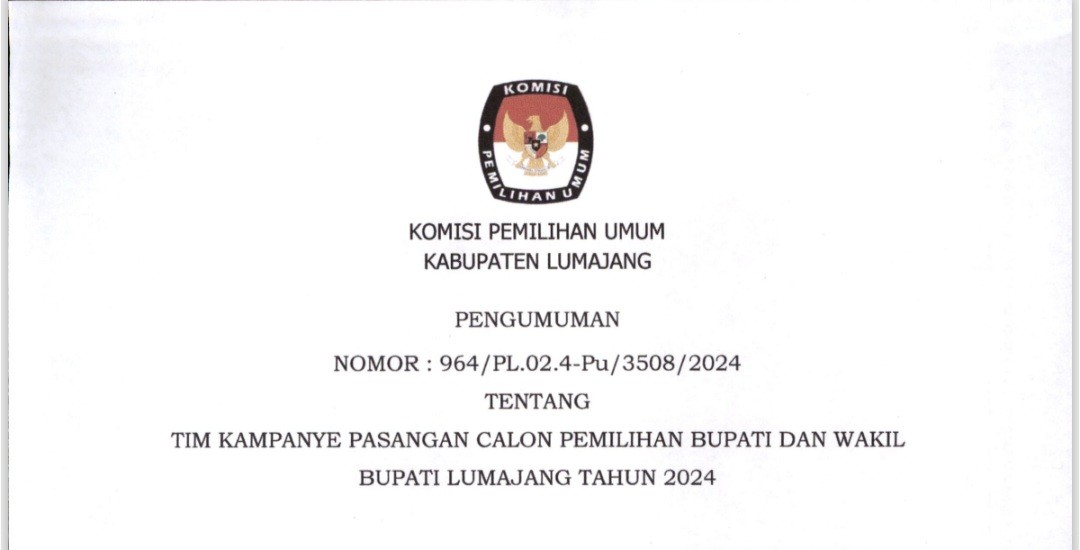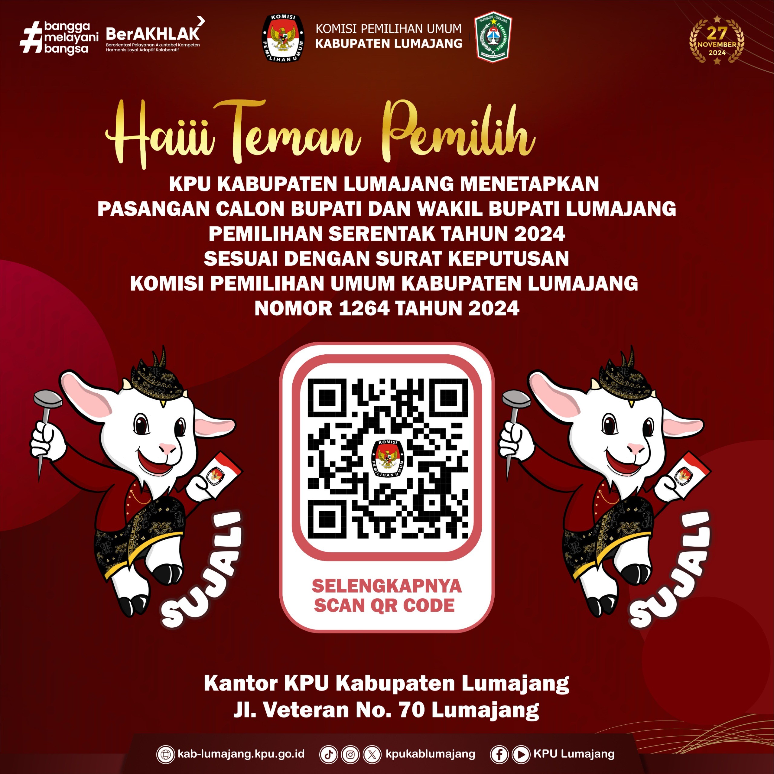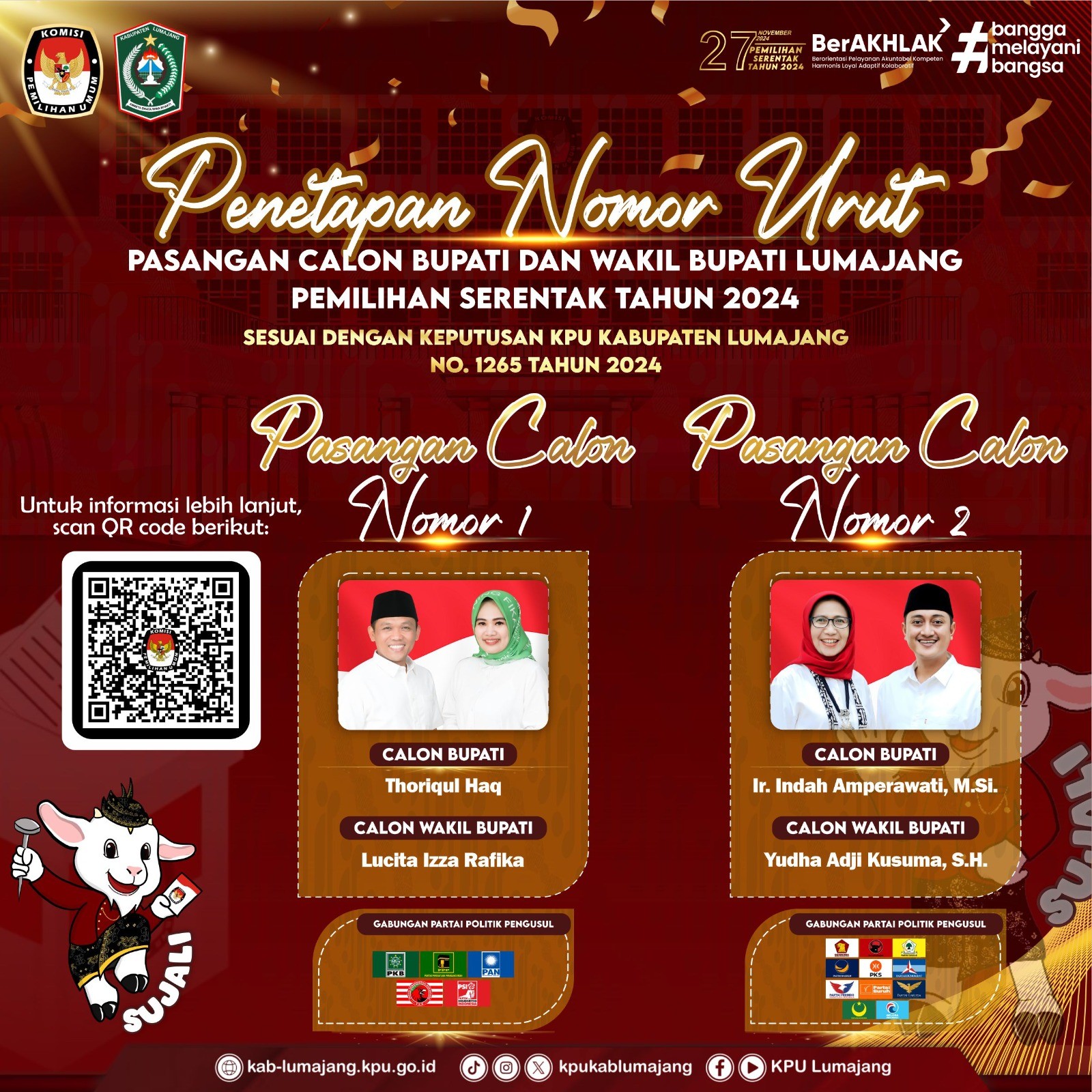 #TemanPemilih Hari ini Senin 23 September 2024, KPU Kabupaten Lumajang Menetapkan Nomor Urut Pasangan Calon Bupati dan Wakil Bupati Lumajang Pemilihan Serentak Tahun 2024 sesuai dengan Surat Keputusan Komisi Pemilihan Umum Kabupaten Lumajang Nomor 1265 Tahun 2024