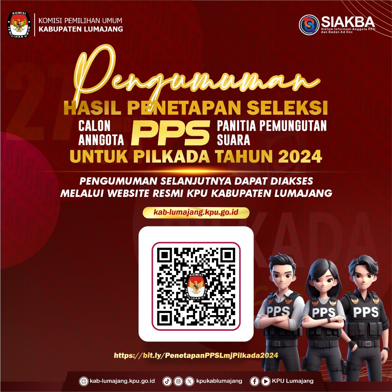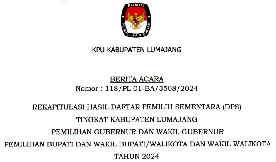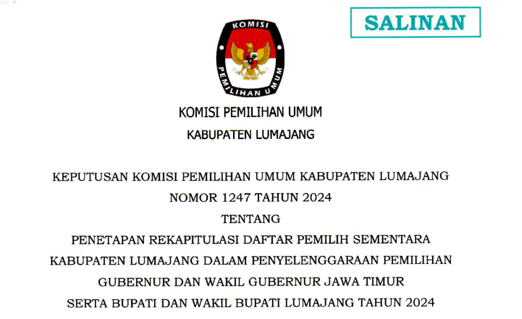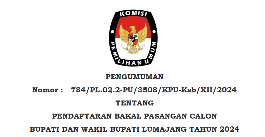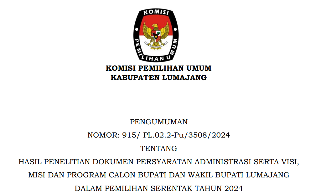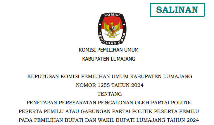 #TEMANPEMIILH BERIKUT KEPUTUSAN KOMISI PEMILIHAN UMUM KABUPATEN LUMAJANG NOMOR 1255 TAHUN 2024 TENTANG PENETAPAN PERSYARATAN PENCALONAN OLEH PARTAI POLITIK PESERTA PEMILU ATAU GABUNGAN PARTAI POLITIK PESERTA PEMILU PADA PEMILIHAN BUPATI DAN WAKIL BUPATI LUMAJANG TAHUN 2024. SELENGKAPNYA KLIK TAUTAN DIBAWAH INI