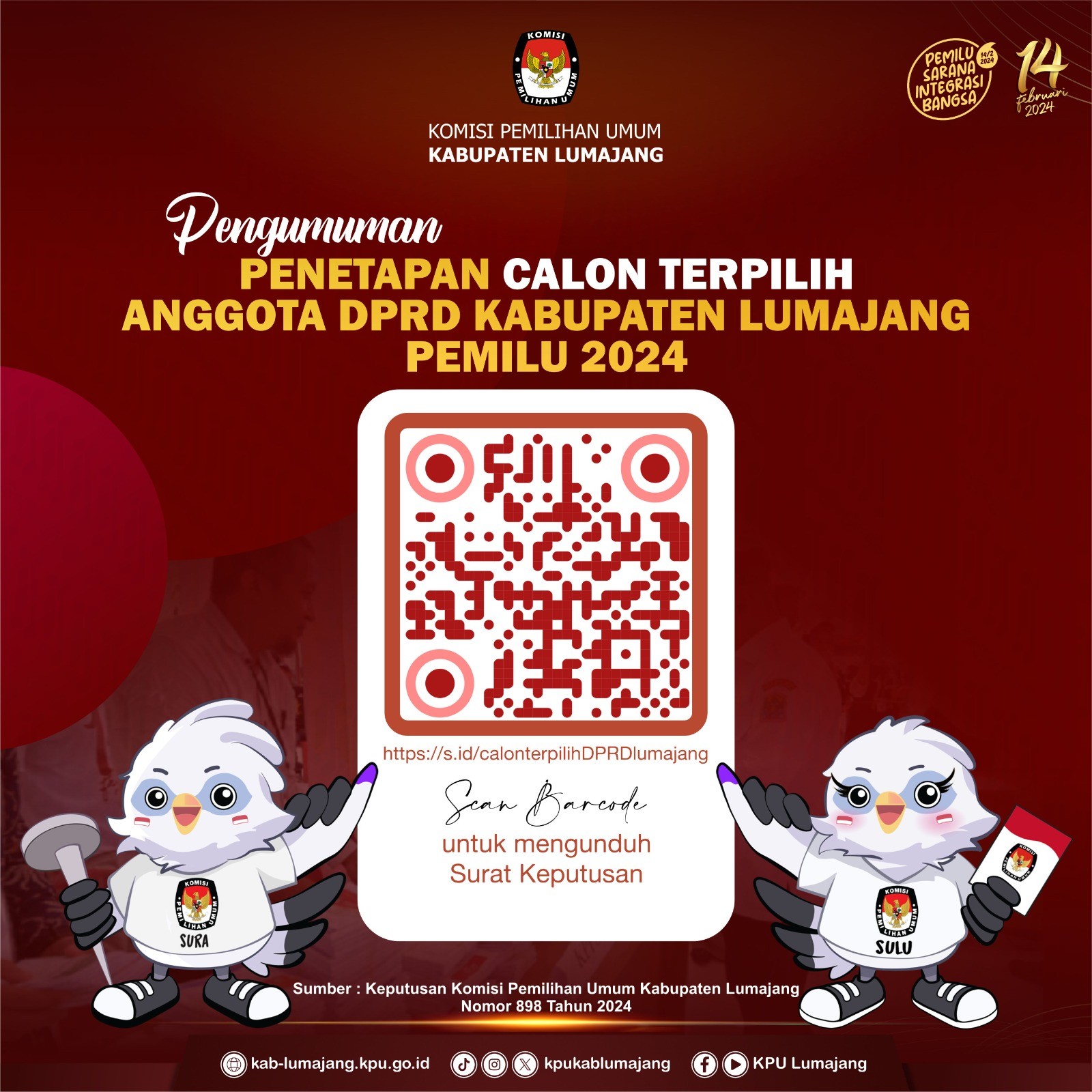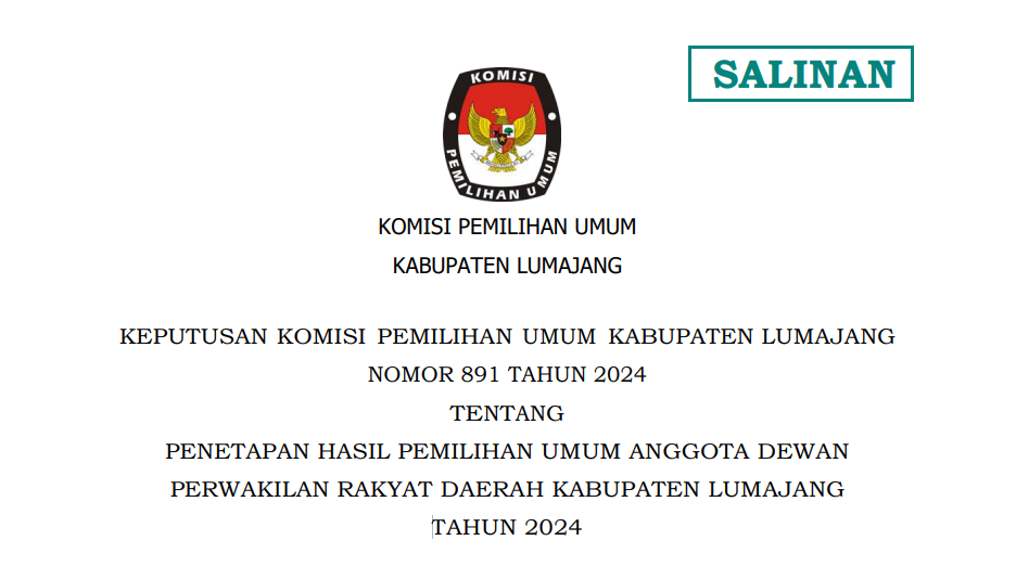 Berikut Keputusan Komisi Pemilihan Umum Kabupaten Lumajang Nomor 891 Tahun 2024 tentang Penetapan Hasil Pemilihan Umum Anggota Dewan Perwakilan Rakyat Daerah Kabupaten Lumajang Tahun 2024