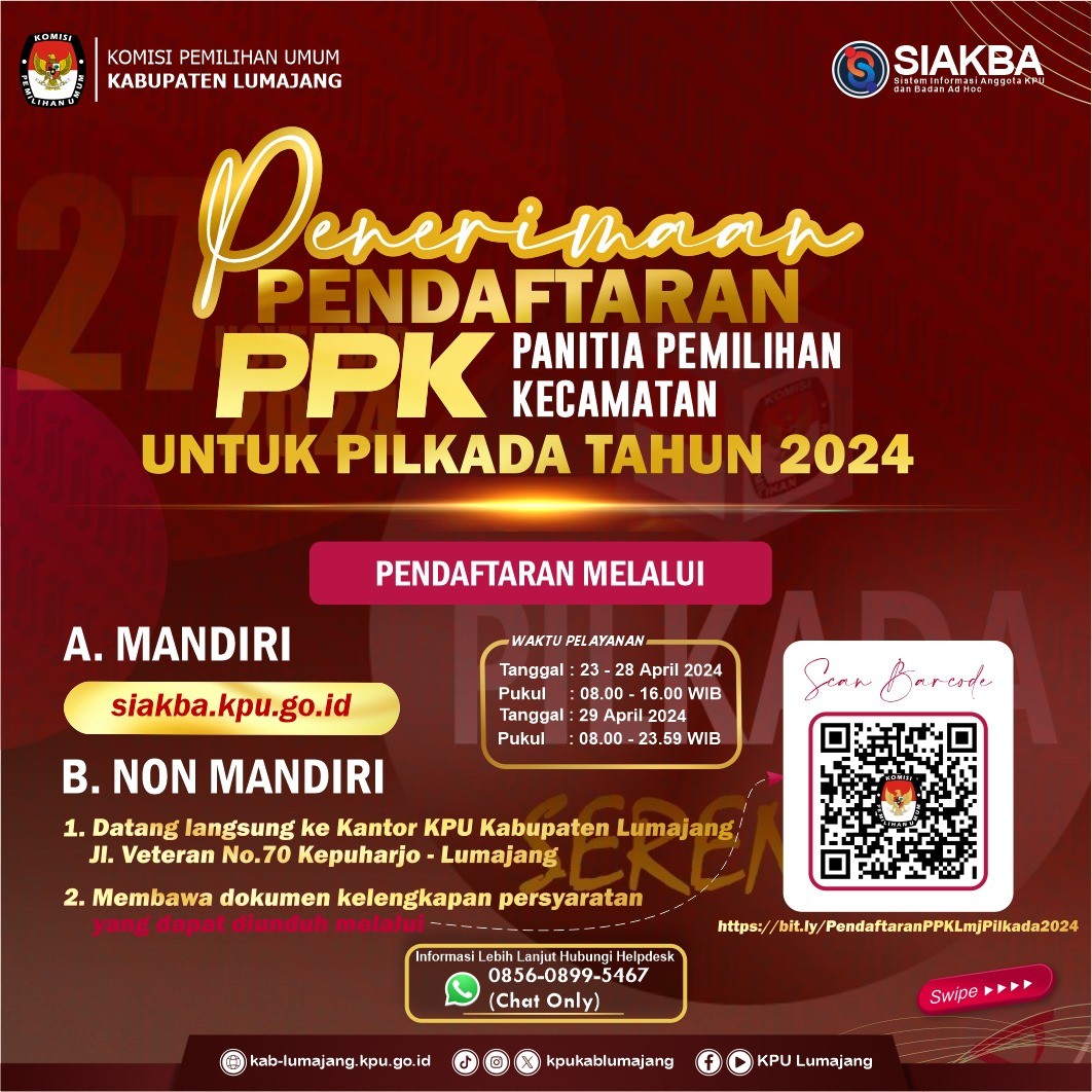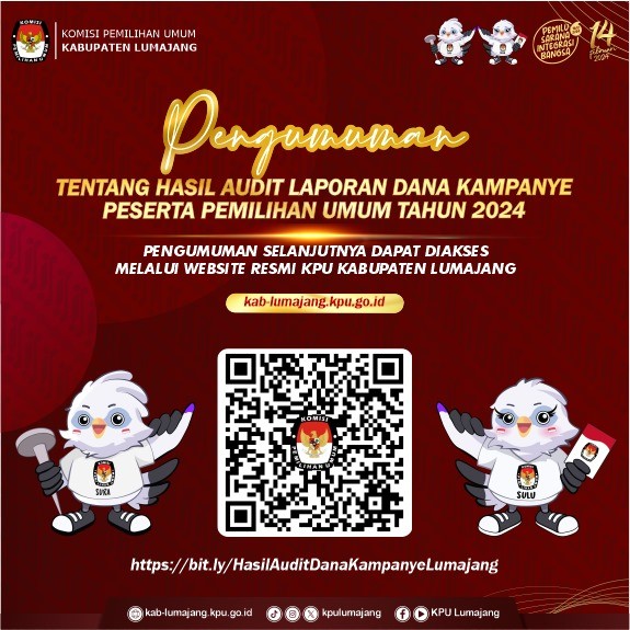 Berikut Pengumuman Nomor : 229/PL.01.8-Pu/3508/2024 Tentang Pengumuman Hasil Audit Laporan Dana Kampanye Peserta Pemilihan Umum Tahun 2024. Pengumuman lengkapnya dapat diunduh pada link di bawah ini