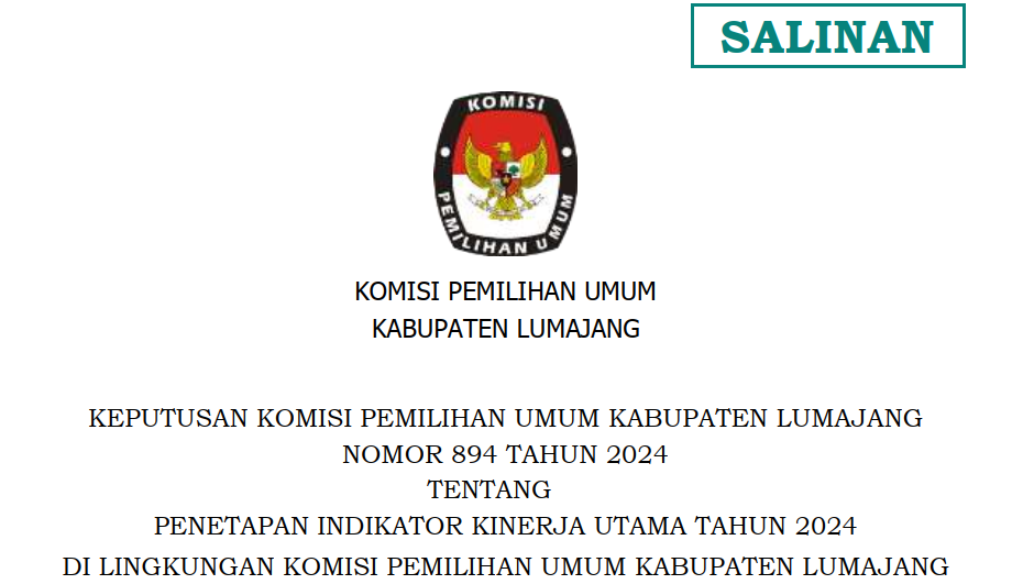 BERIKUT KEPUTUSAN KOMISI PEMILIHAN UMUM KABUPATEN LUMAJANG NOMOR 894 TAHUN 2024 TENTANG PENETAPAN INDIKATOR KINERJA UTAMA TAHUN 2024 DI LINGKUNGAN KOMISI PEMILIHAN UMUM KABUPATEN LUMAJANG
